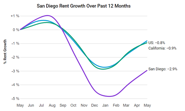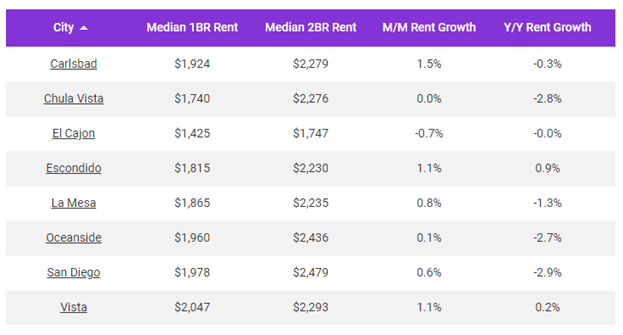 San Diego rents are up 0.6% month-over-month and down 2.9% year-over-year
